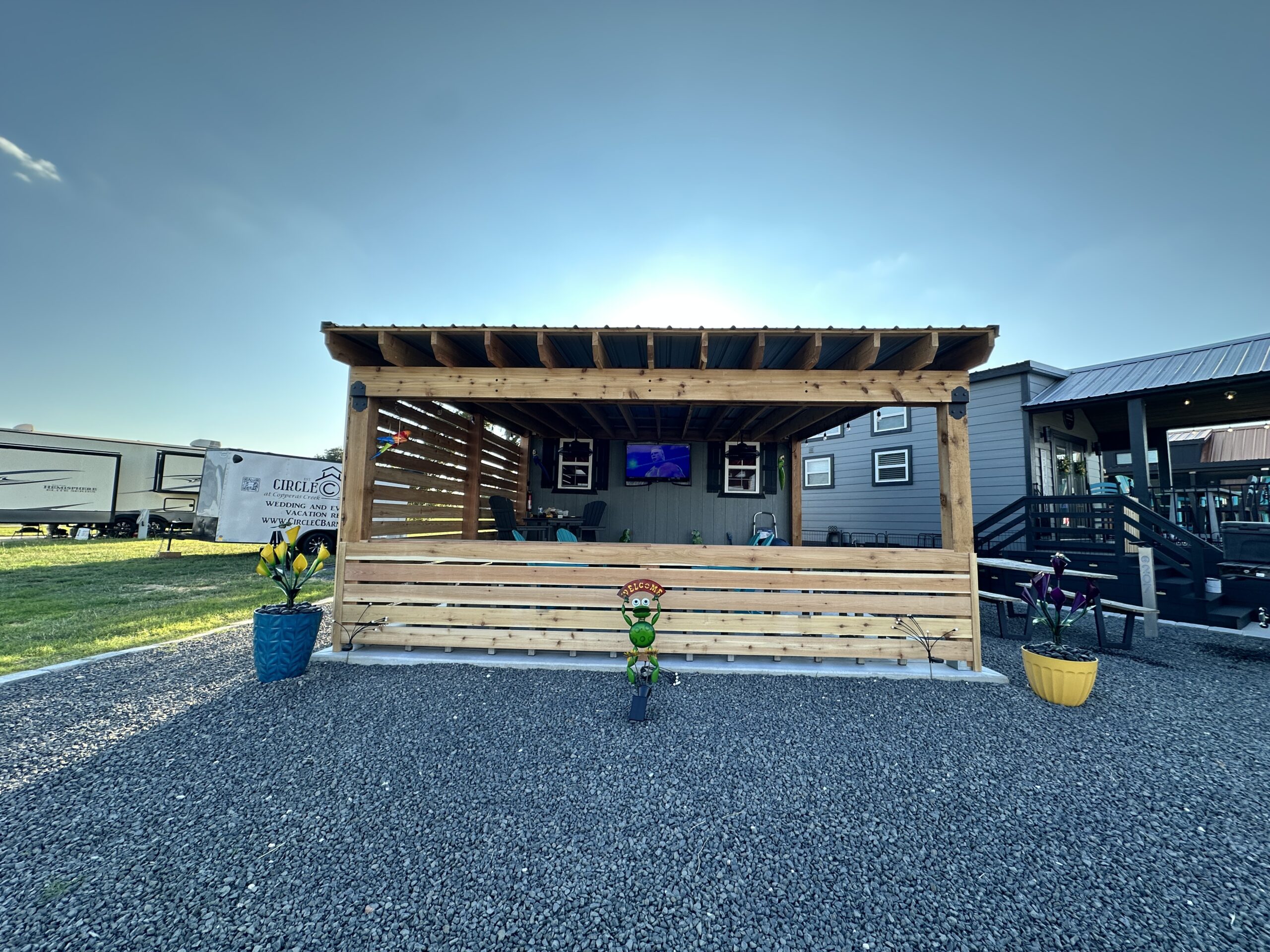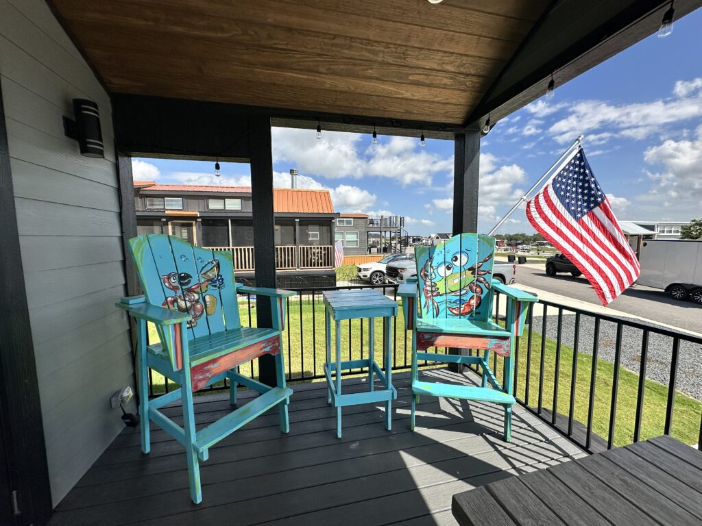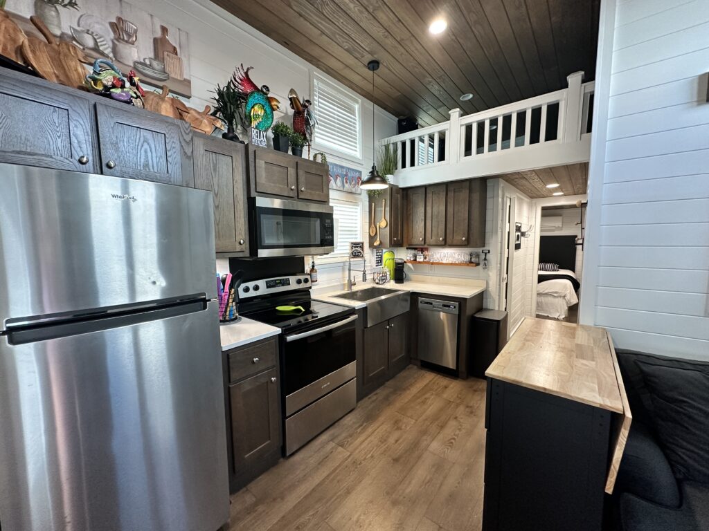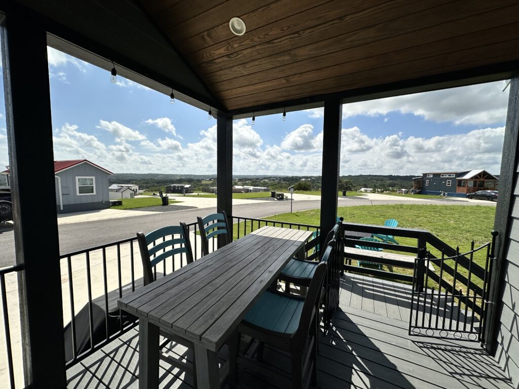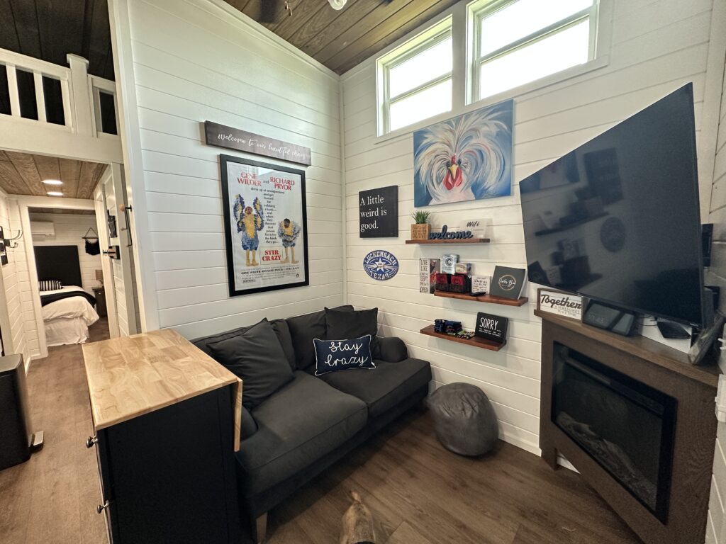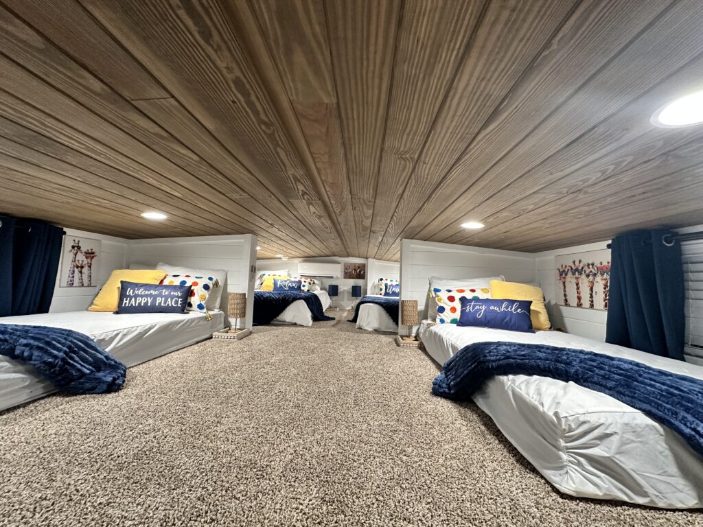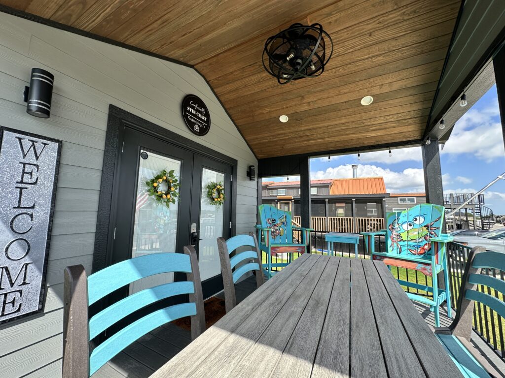 Sometimes you just feel STIR-CRAZY and the owners want you from the minute you arrive, to enjoy the views and settle in whether you are a small group or as many as 7 adults. This home offers a downstairs master bedroom and a double loft that includes 1 queen bed and 3 twin beds. The loft includes a 2nd TV for separate viewing. The downstairs master has a queen bed with a full on-suite bath. There is a hall half bath that provides additional convenience for your group. Downstairs living area you have the main TV with a fireplace below. This home offers a covered porch with outdoor seating – just swing the double French doors open to expand the living area and well-appointed kitchen. Your kitchen includes full size appliances, a dishwasher, and other small convenience items – air fryer, toaster, crock pot, and blender. Steps outside is your private covered pavilion with 65” TV with WIFI, Propane Fire Pit, Propane Gas Grill, seating and Picnic table to enjoy TV Viewing and cookouts. Comfortably Stir-Crazy #207 is located conveniently between the Phase 2 club house with family friendly amenities, weekend bands and food trucks, and Phase 3 which when open will include a 2nd club house, Pickle Ball, and Mini Golf. Their hope is you sit around your own private Propane firepit – propane is provided – and leave the Stir-crazy feeling behind. * This unit is pet friendly