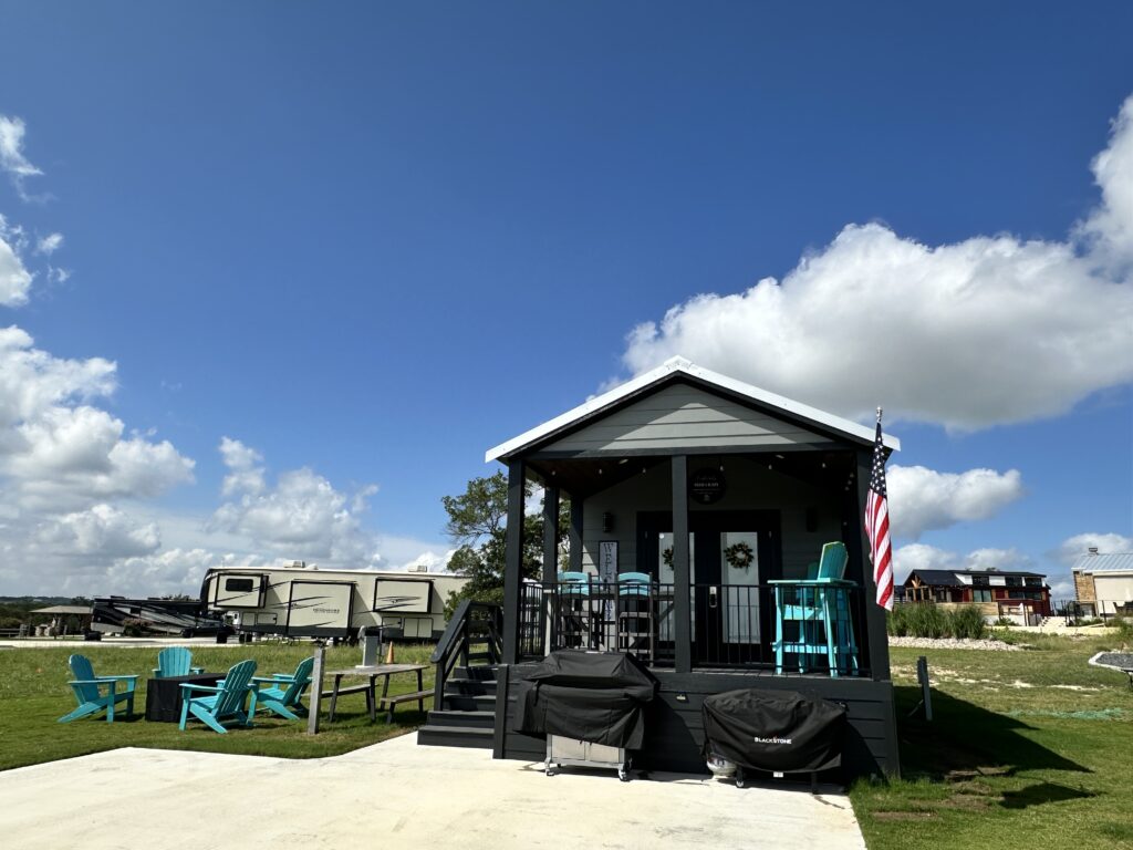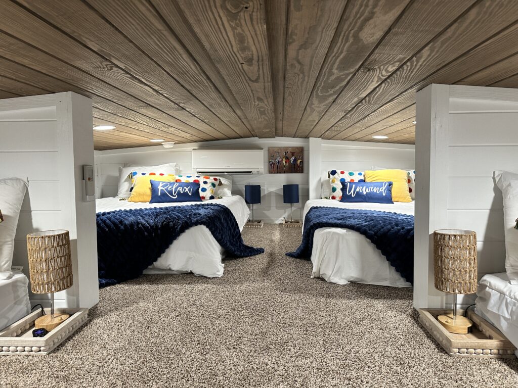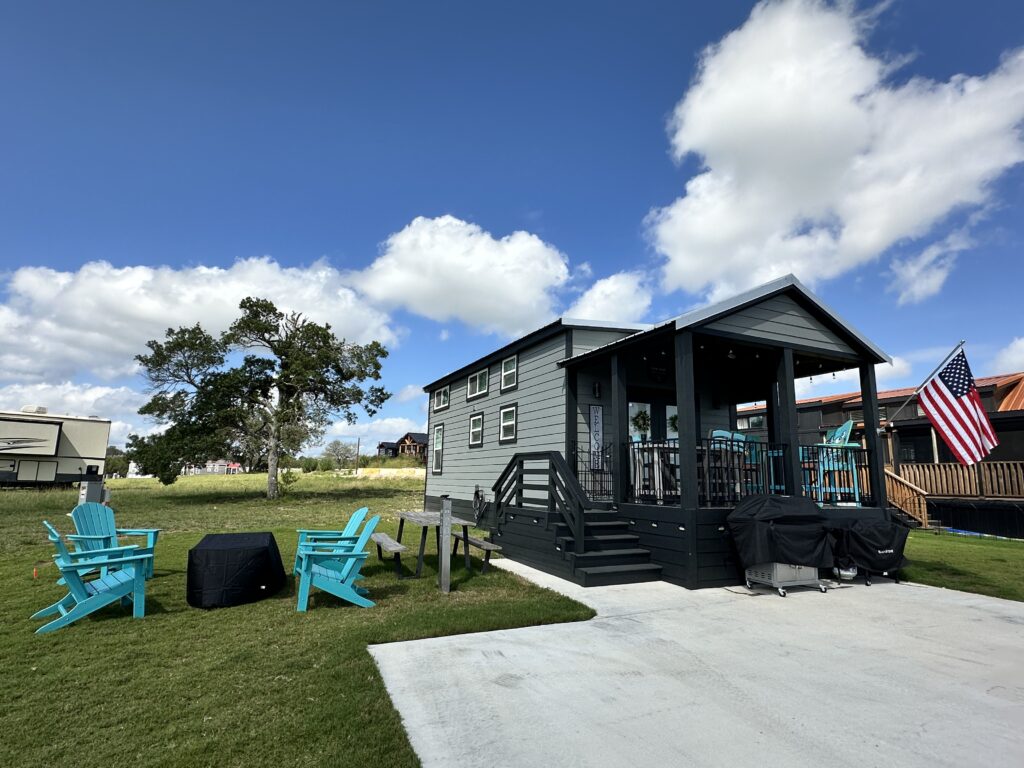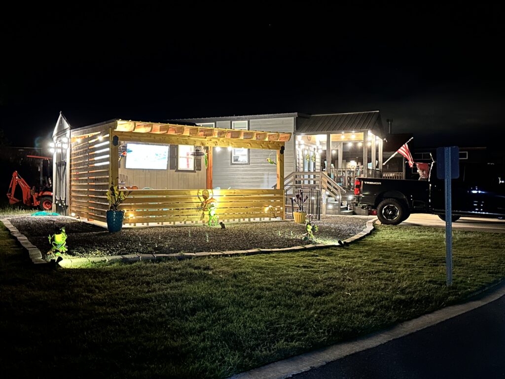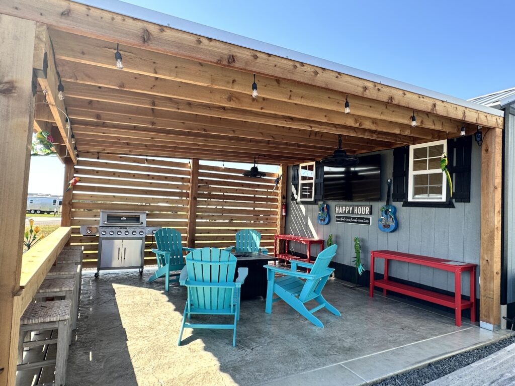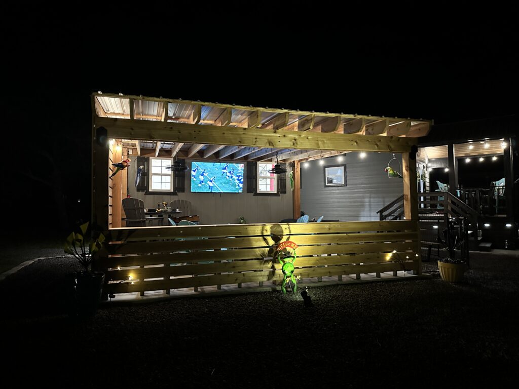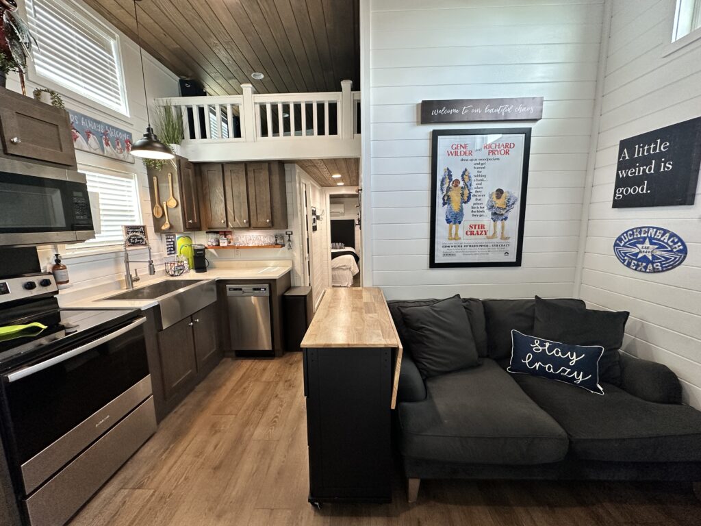 Sometimes you just feel STIR-CRAZY and the owners want you from the minute you arrive, to enjoy the views and settle in whether you are a small group or as many as 7 adults. This home offers a downstairs master bedroom and a double loft that includes 1 queen bed and 3 twin beds. The loft includes a 2nd TV for separate viewing. The downstairs master has a queen bed with a full on-suite bath. There is a hall half bath that provides additional convenience for your group. Downstairs living area you have the main TV with a fireplace below. This home offers a covered porch with outdoor seating – just swing the double French doors open to expand the living area and well-appointed kitchen. Your kitchen includes full size appliances, a dishwasher, and other small convenience items – air fryer, toaster, crock pot, and blender. Steps outside is your private covered pavilion with 65” TV with WIFI, Propane Fire Pit, Propane Gas Grill, seating and Picnic table to enjoy TV Viewing and cookouts. Comfortably Stir-Crazy #207 is located conveniently between the Phase 2 club house with family friendly amenities, weekend bands and food trucks, and Phase 3 which when open will include a 2nd club house, Pickle Ball, and Mini Golf. Their hope is you sit around your own private Propane firepit – propane is provided – and leave the Stir-crazy feeling behind. * This unit is pet friendly