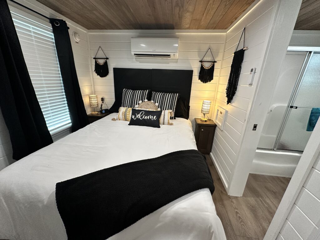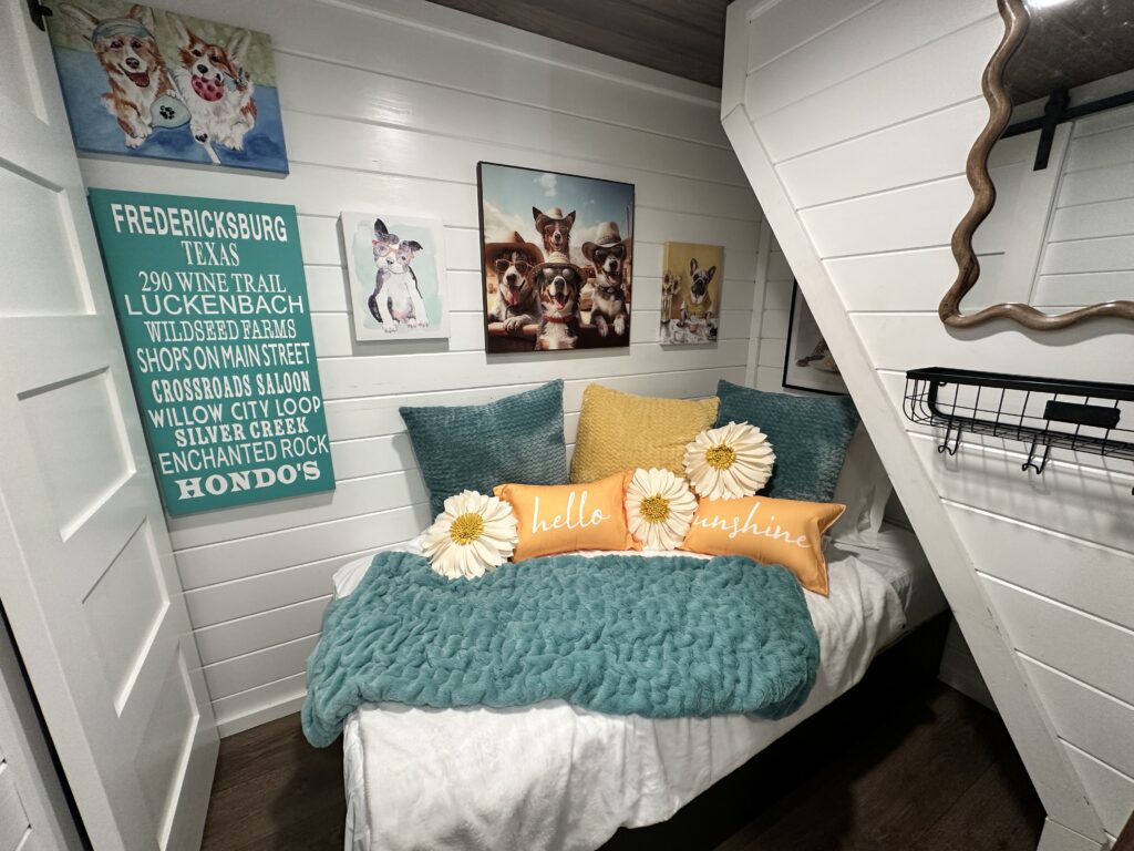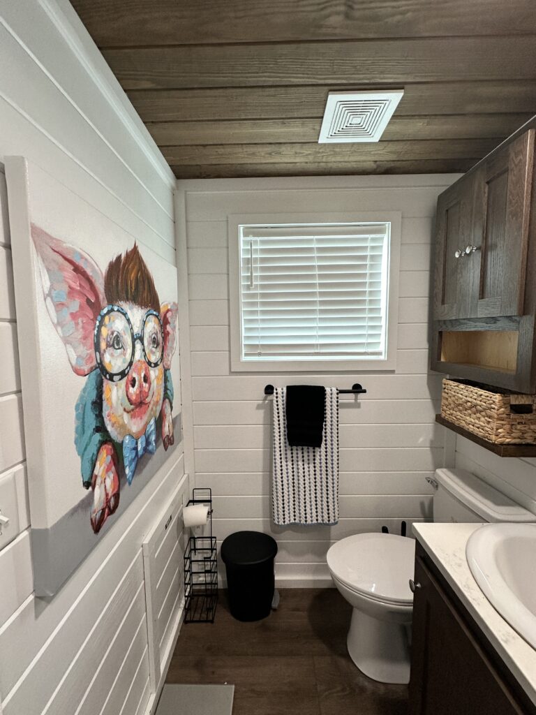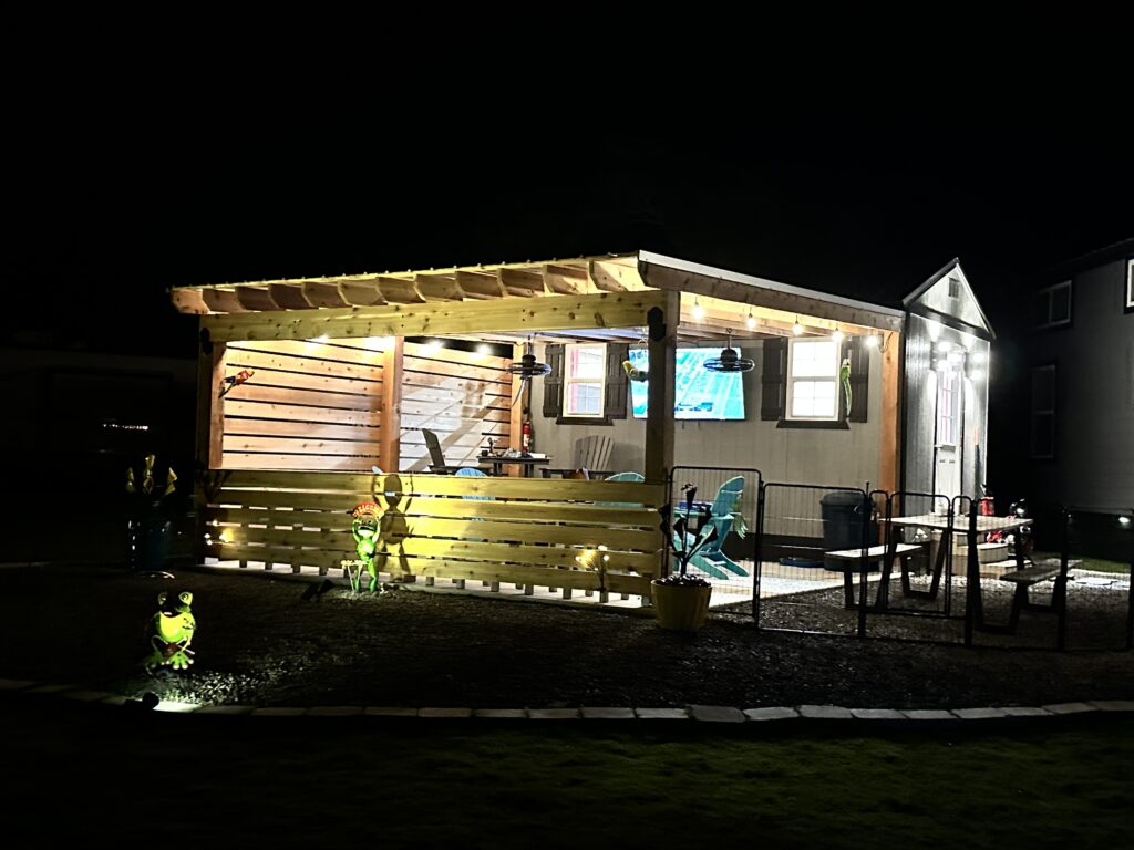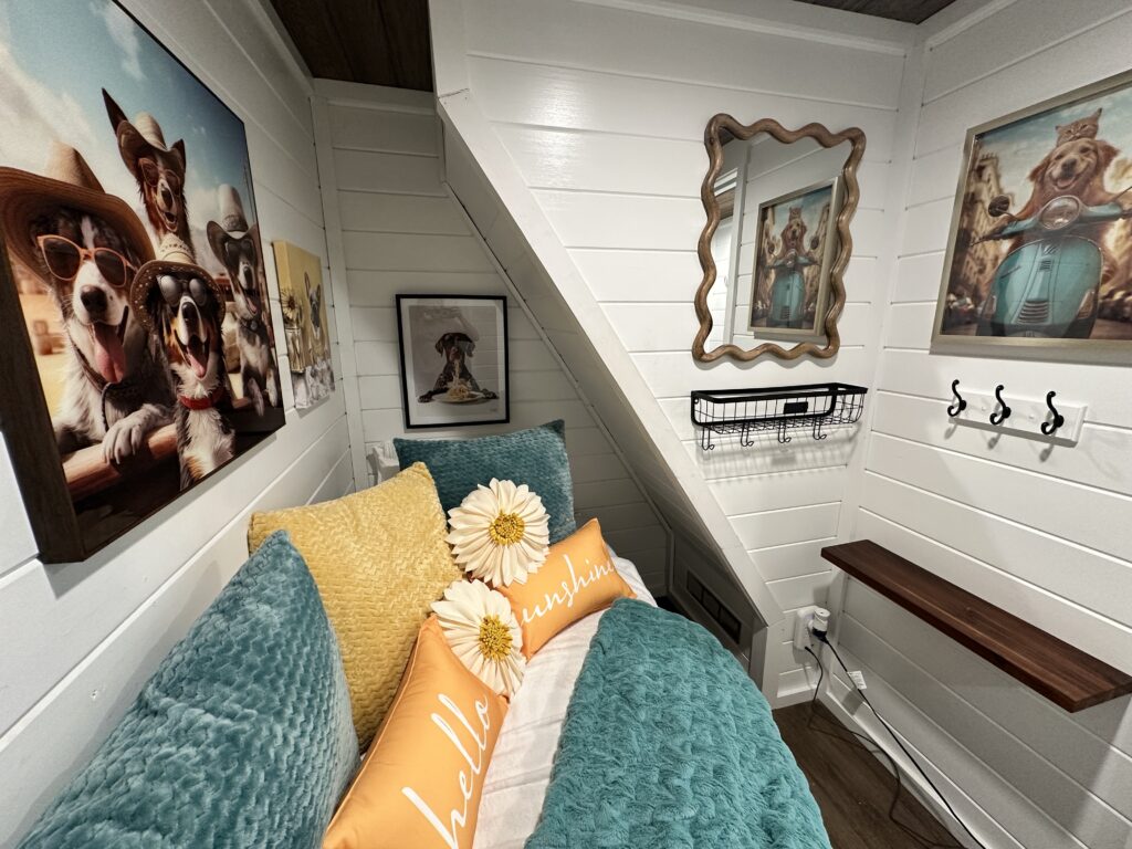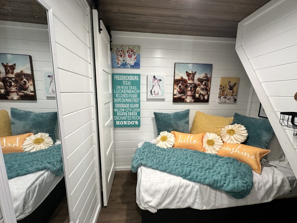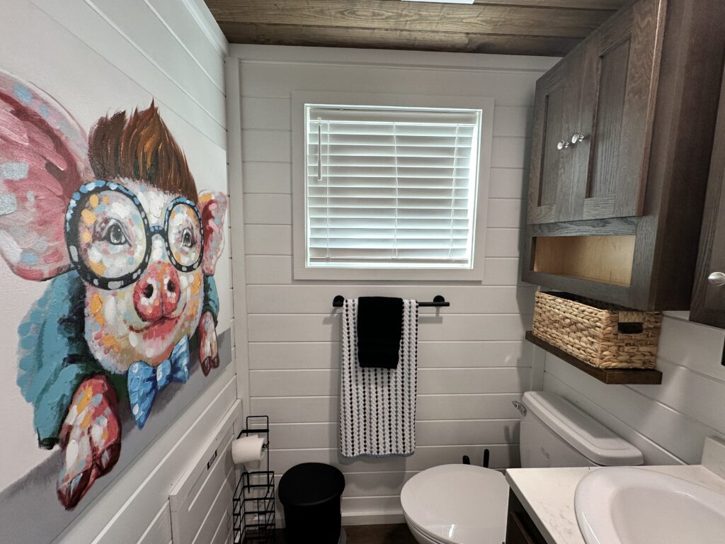 Sometimes you just feel STIR-CRAZY and the owners want you from the minute you arrive, to enjoy the views and settle in whether you are a small group or as many as 7 adults. This home offers a downstairs master bedroom and a double loft that includes 1 queen bed and 3 twin beds. The loft includes a 2nd TV for separate viewing. The downstairs master has a queen bed with a full on-suite bath. There is a hall half bath that provides additional convenience for your group. Downstairs living area you have the main TV with a fireplace below. This home offers a covered porch with outdoor seating – just swing the double French doors open to expand the living area and well-appointed kitchen. Your kitchen includes full size appliances, a dishwasher, and other small convenience items – air fryer, toaster, crock pot, and blender. Steps outside is your private covered pavilion with 65” TV with WIFI, Propane Fire Pit, Propane Gas Grill, seating and Picnic table to enjoy TV Viewing and cookouts. Comfortably Stir-Crazy #207 is located conveniently between the Phase 2 club house with family friendly amenities, weekend bands and food trucks, and Phase 3 which when open will include a 2nd club house, Pickle Ball, and Mini Golf. Their hope is you sit around your own private Propane firepit – propane is provided – and leave the Stir-crazy feeling behind. * This unit is pet friendly